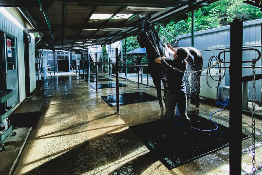 馬のストレス発散、健康管理、筋肉の維持には最適で6頭同時に運動が可能です。床材にドイツ製ゴムブロックを使用していますので、肢に掛かる負担も軽減されます。